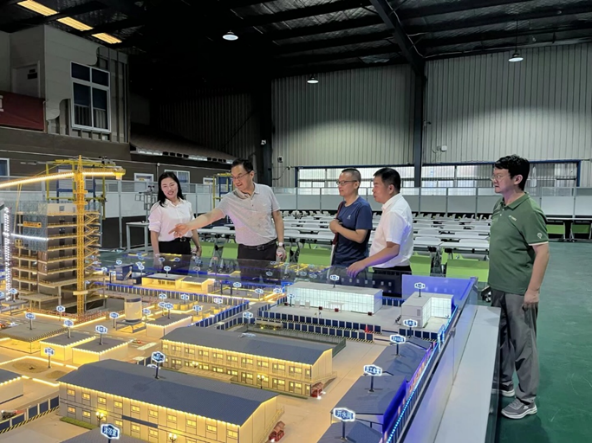 在湖北城市建设职业技术学院副校长易操、建筑工程学院院长文学、副院长胡永骁及相关专业教师的陪同下,陈伟一行先后参观了深基坑实训基地、新质生产力实训基地、机器人实训基地、装配式全产业链实训基地、世赛混凝土与砌筑省级集训基地以及智能建造虚拟仿真实训基地等校内实践教学场所。本次行程重点参观了由湖北城市建设职业技术学院与中国建筑第三工程局共同建设的新质生产力实训中心,详细了解了该中心作为全国首个覆盖设计、生产、施工与运维各环节、聚焦智能建造全生命周期的实训平台的功能与特色。在机器人实训基地,代表团观摩了多类先进机器人系统,包括测绘机器人、喷涂机器人和3D打印建筑机器人等。在智能建造虚拟仿真实训基地,师生体验了数字孪生与虚拟现实(VR)等技术在构建高度仿真工程场景中的应用。